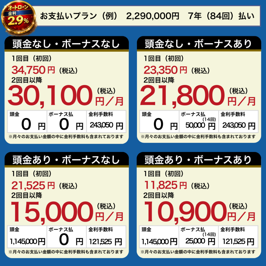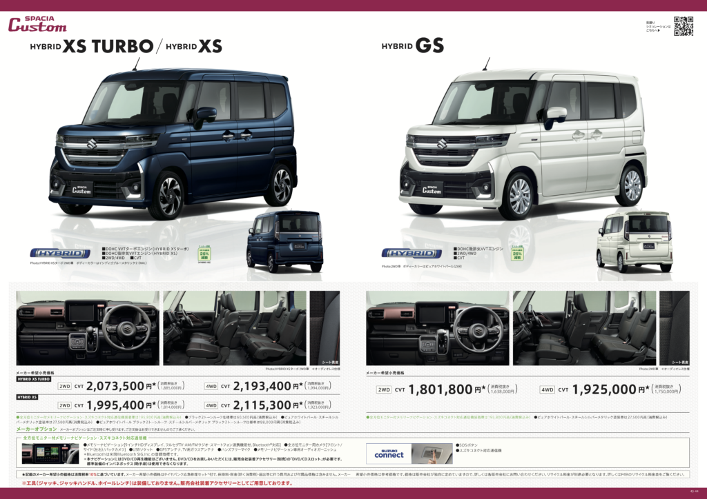 スペーシアカスタムXSMON2WD 新車お見積りシミュレーション 車両価格 特別塗装色 なし ピュアホワイトパール・スチールシルバーメタリック(+27,500円) ブラック2トーンルーフ(+60,500円) ピュアホワイト・スチールシルバーブラック2トーンルーフ(+88,000円) 防錆塗装 なし スリーラスター(+27,500円) ドライブレコーダー 前方カメラ 前後カメラ(+31,284円) ETC 社外ETC 純正ETC(+6,380) フロアマット フロアマット(ジュータン) フロアマット(トレー)(+2,420円) フロアマット(レイヤードストラータ)(+9,680円) ナンバープレート 通常ナンバー 希望ナンバー(+8,600円) 全国図柄モノトーンナンバー(+14,900円) 全国図柄カラーナンバー(+15,900円) オプション合計 0円 支払総額 0円 オートローンシミュレーション ローン元金 頭金 ボーナス加算(1回) ※ボーナス払いは年2回加算 金利(%) 支払回数 36 48 60 72 84 96 120 月々のお支払い(参考) 0円〜 ※参考支払例 ※表示の月額はシミュレーションです。 ※実際のローン契約では月々のお支払いは100円単位となり 端数は初回お支払い時に調整される場合があります。 無料相談・試乗予約はこちら