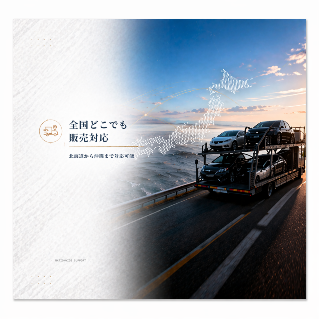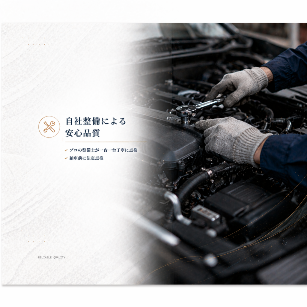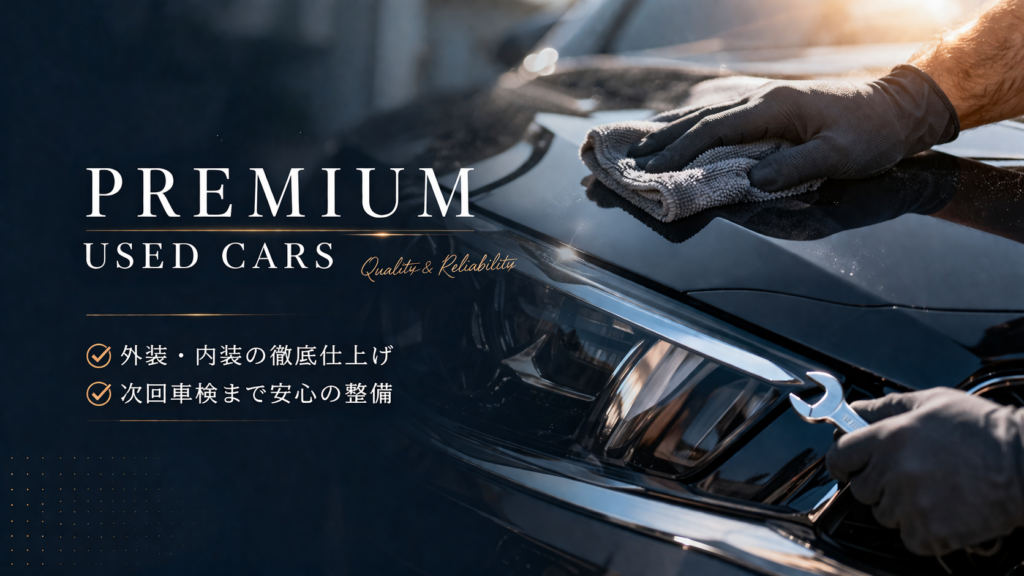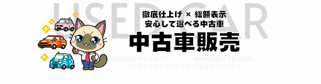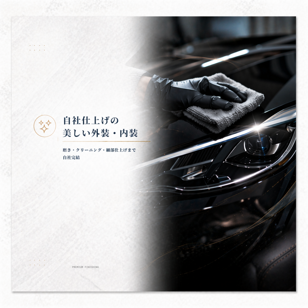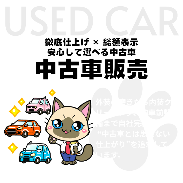 仕上がりに自信次の車検まで安心して乗れる中古車 自社整備・自社仕上げだからこそ提供できる高品質な中古車。全国どこへでも販売対応いたします。 ◼︎当社の中古車の特徴 自社整備による安心品質 プロの整備士が一台一台を丁寧に点検。納車前には法定点検を行い「安心整備」を実施しています。 自社仕上げの美しい外装・内装 磨き・クリーニング・細部仕上げまで自社完結。走り出しから気持ち良く乗れる1台に仕上げます。 全国どこでも販売対応 北海道から沖縄まで対応可能。遠方でも安心して購入できる体制を整えています。 ◼︎自社仕上げのこだわり ボディに磨きをかけて輝きを取り戻す 施工前 施工後 室内を徹底クリーニングで新車の状態に近く 施工前 施工後 エンジンルームのクリーニング 施工前 施工後 ヘッドライトの黄ばみ除去 施工前 施工後 外装の磨き・ヘッドライトのくすみ取り・室内クリーニング・消臭など、細部まで徹底仕上げ。中古車の印象を大きく左右するポイントにこだわり、気持ち良く乗れる1台を作り上げます。 ◼︎納車前整備について ご購入いただいたお車は、納車前に以下の整備を実施しています。エンジンオイル交換ブレーキ点検整備バッテリー点検、交換下回り点検整備タイヤ点検ライト、電装点検整備消耗品チェック交換「納車後すぐに不具合…」を防ぐための徹底整備です。 ◼︎全国どこからでもご購入可能 ①お問い合わせ 気になるお車は電話・LINE・お問い合わせフォームからお気軽にご相談下さい。 ②状態説明(写真・動画等) 外装・内装・下回りまで詳しくご説明いたします。 ③ご契約→整備→仕上げ ご契約後、納車前整備と最終仕上げを実施いたします。 ④御納車 店頭にて車両のご説明をさせていただき御納車。遠方の場合は陸送により御納車いたします。 カーセンサーで在庫を見る ➡︎ グーネットで在庫を見る ➡︎ 展示にない車種もお探しいたします 展示場にご希望の車種がない場合でも、お任せください。当店は全国のオークション会場を活用し、お客様一人ひとりのご要望に合った「理想の1台」を丁寧に探し出します。豊富な在庫の中から、年式・走行距離・車体の状態・装備内容などを細かく確認しながら、信頼できる車両だけを厳選。ご予算や条件に合わせて、最適な選択肢をご提案いたします。展示場では出会えない、状態の良い車や希少車種との出会いも、ぜひ当店にお任せください。心から納得できる1台との出会いを、全力でサポートいたします。 中古車のご相談はこちら